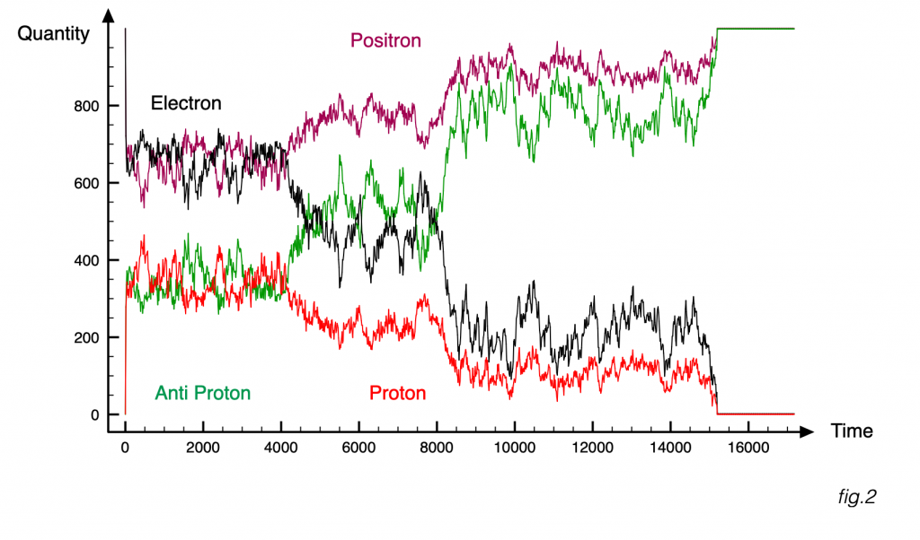 Figure 2. shows the typical development of the quantities for the different particles in time of the simplified world starting with 1000 electrons, 1000 positrons, 0 protons and 0 anti-protons. It’s ending with only anti-protons and positrons.
