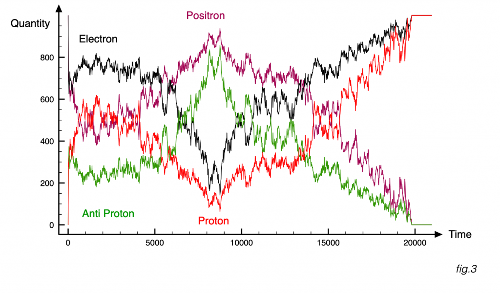 Figure 3. shows the typical development of the quantities for the different particles in time of the simplified world starting with 1000 electrons, 1000 positrons, 0 protons and 0 anti-protons. It’s ending with only protons and electrons.